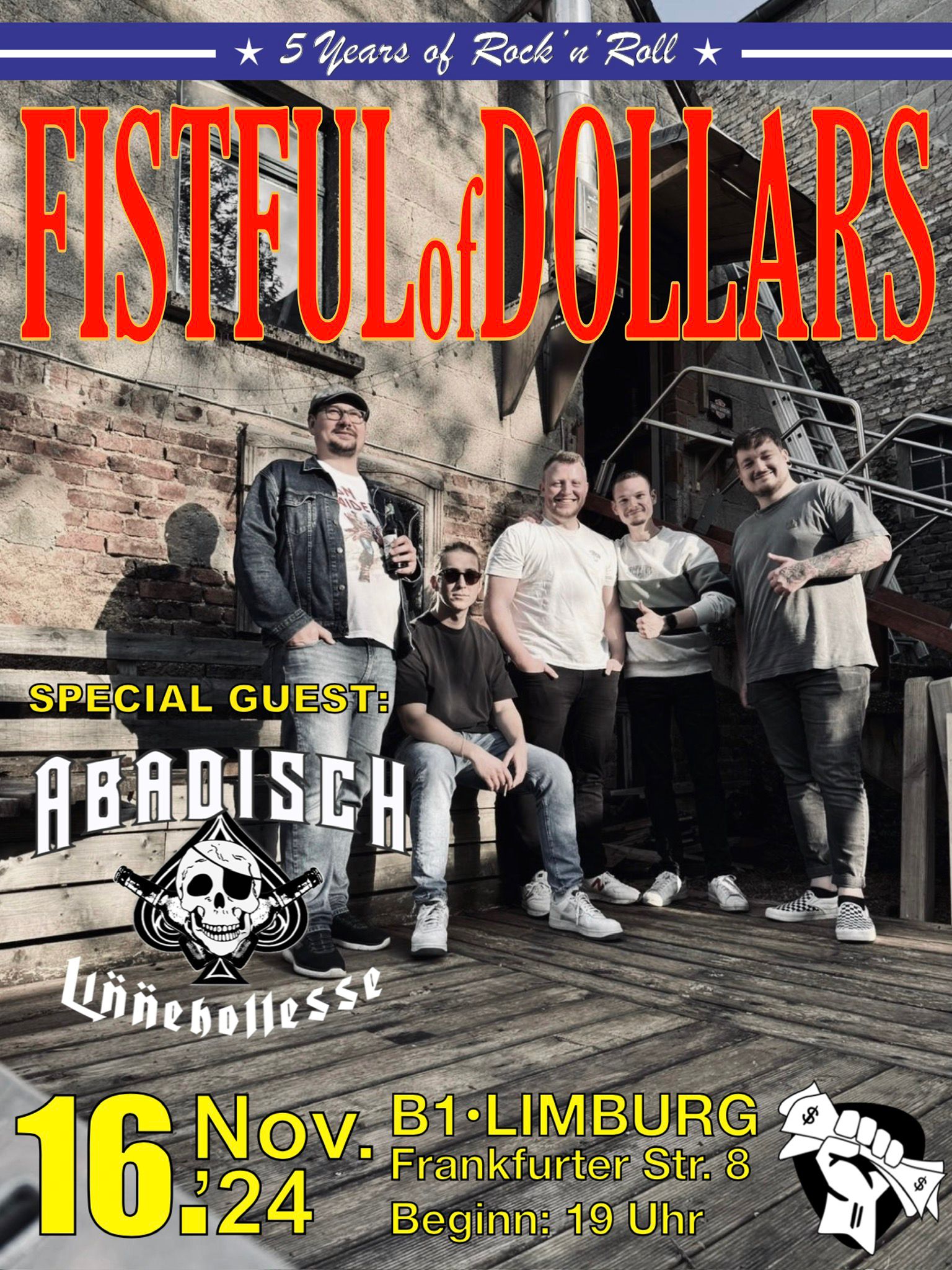 Unglaublich, aber wahr: Fistful of Dollars wird in diesem Jahr 5 Jahre! Nachdem wir die Kirmessaison '24 erfolgreich hinter uns gebracht haben, wollen wir daher nochmal mit unseren treuen Fans feiern und zwar am 16.11. ab 19 Uhr im B1 in Limburg, der Eintritt ist frei! Als Support mit dabei sind Abadisch mit unserem Kall an der Lead-Gitarre. Kommt rum und feiert mit uns🤘